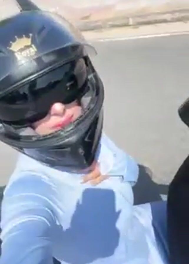 A person wearing a black "Royal" helmet with sunglasses and a light blue long-sleeve shirt is riding on a motorcycle