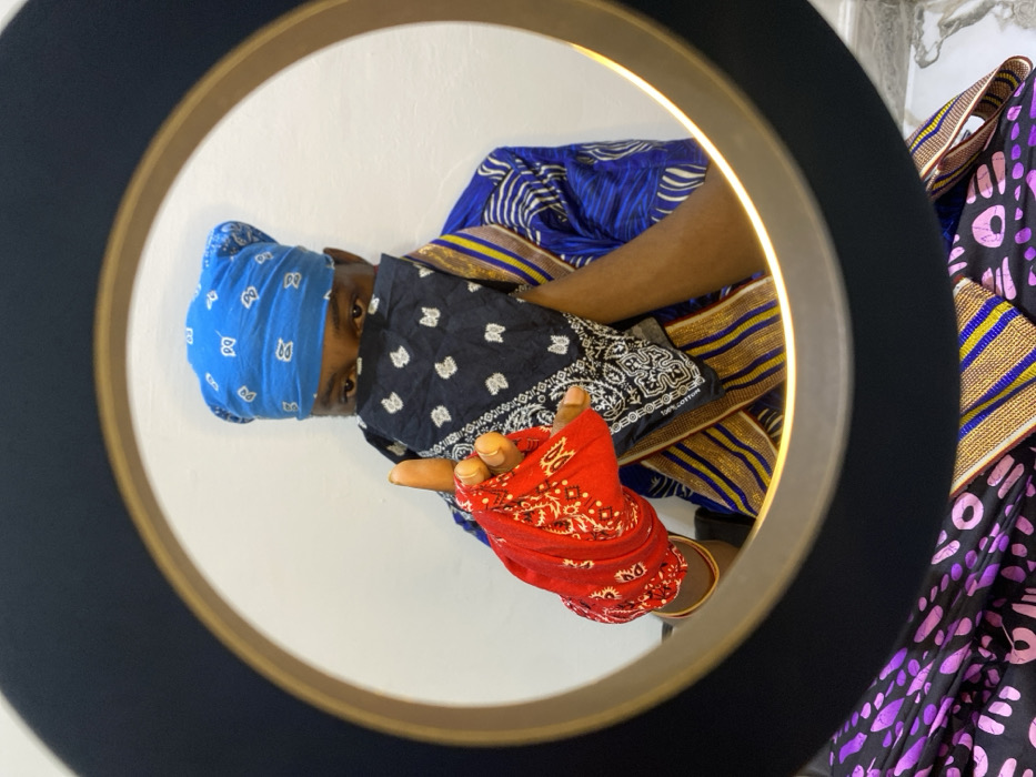 An individual is depicted indoors in Oduman, Ghana, viewed through a circular black frame with a golden inner rim, resembling a ring light. The subject's upper body faces forward. A blue bandana is tied on the head, covering the forehead. A black bandana with white paisley patterns covers the lower half of the subject's face, obscuring the nose and mouth. The text "100% COTTON" is visible on the lower left of this black bandana. The subject wears a blue garment with white textured stripes, overlaid by a fabric featuring horizontal stripes of gold, blue, and black. The left hand is extended towards the viewer, wrapped in a red bandana with white paisley patterns, forming a fingerless glove. The index finger of the left hand is pointed forward. A thin, gold-colored bracelet is visible on the left wrist. The background directly behind the subject is a plain white wall. In the lower left of the frame, a black fabric with large purple and black oval patterns is visible, consistent with a lower garment or draped material.