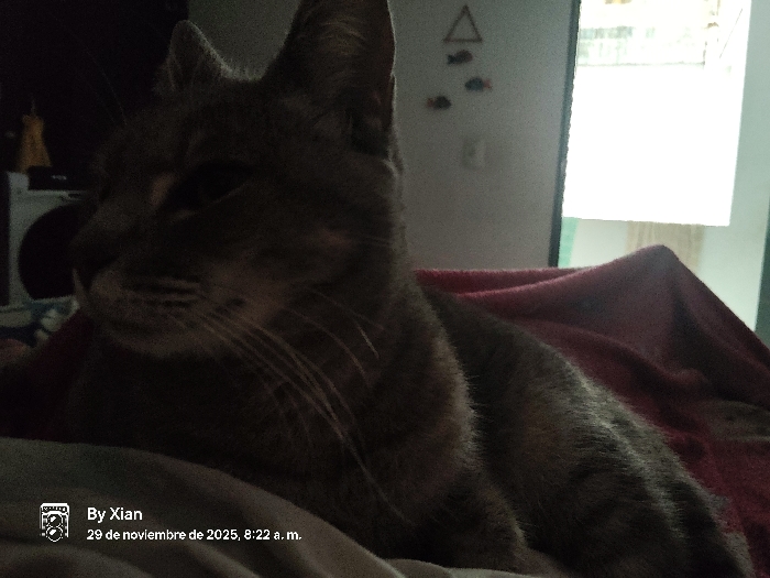 A domestic short-haired cat, primarily grey/brown with tabby-like markings, rests in the foreground, facing left with its head slightly turned down. Its ears are upright. The cat is situated on a light-colored surface and partially covered by a dark red or maroon blanket on the right side of the frame. In the dimly lit background to the left, a white appliance with a circular element is visible, with a yellow decorative object positioned above it. To the right, a brightly overexposed rectangular opening, likely a window or door, indicates an outdoor area or strong light source. Adjacent to this opening, on a white wall, three small fish-shaped decorations and a triangular symbol are affixed. The scene is an interior setting in the city of Cali, Colombia. A watermark in the lower-left corner states "By Xian" and "29 de noviembre de 2025, 8:22 a. m."