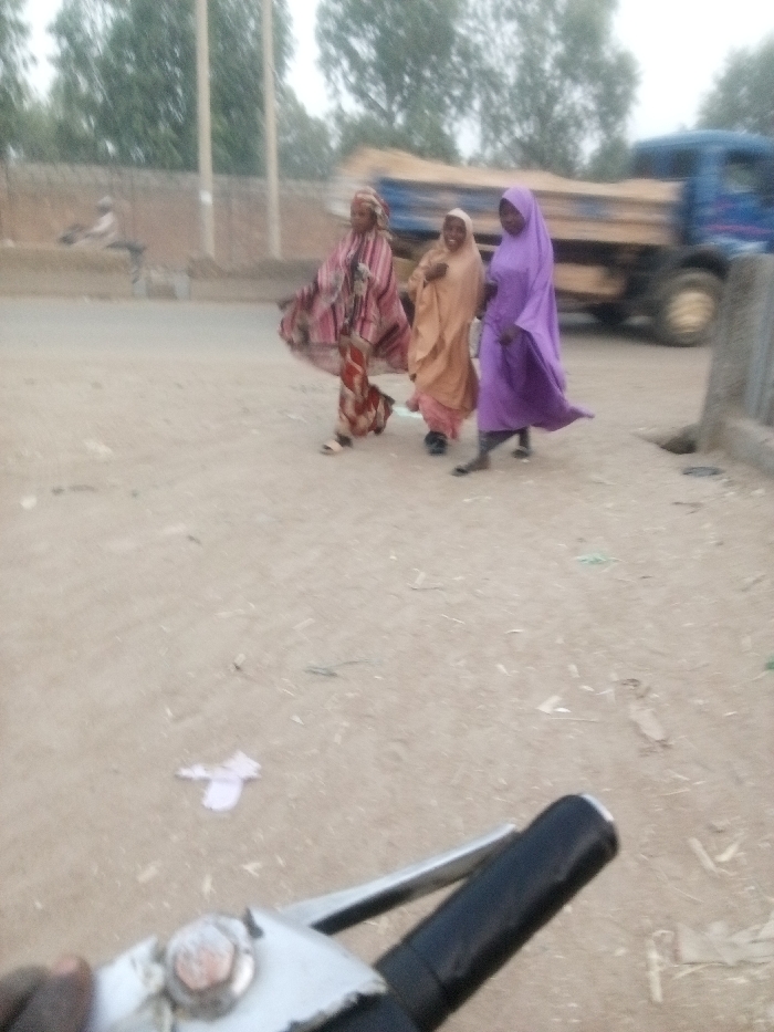 Three women walk across a sandy road, wearing traditional clothing including hijabs. One woman wears a striped, flowing garment, another a tan hijab, and the third a purple one. A truck with a blue cab is blurred in the background. A motorcycle handlebar and grip are visible in the foreground, suggesting the photo was taken from a moving vehicle. The scene has a slightly hazy and desaturated quality.
