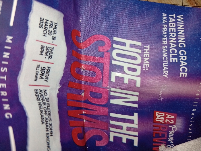 The image displays a single, vertically oriented flyer or banner, predominantly purple with a gradient background transitioning to lighter hues of pink and blue. The object is resting on a light brown, textured surface, possibly wood. The flyer promotes a religious event with the central theme "HOPE IN THE STORMS," presented in large white and red lettering. The event is hosted by "WINNING GRACE TABERNACLE AKA PRAYER SANCTUARY" and is an "A2 Power Breakthrough Day Revival." The dates for the event are "THUR. 19 - FRI. 20 MARCH 2026." Scheduled times include "THUR. 5PM - 8PM" and "FRIDAY 9PM TILL DAWN." The location specified on the flyer is "NO. 28 ELERIUS JOHN AVENUE OFF ANAN EKONG EKPRI NSUKARA," situated within the region of Ekpri Nsukara. The flyer shows minor creasing and some white scuff marks, particularly over the red "STORMS" text. No individuals are present in the frame.