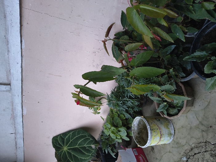 The scene depicts a collection of potted plants situated against a light-colored wall in Basey, Philippines. The wall, colored a faded peach or light tan, occupies the upper half of the frame, showing minor surface imperfections and dirt marks. A white, weathered wooden window frame or sill runs horizontally across the top portion of the wall. The lower half of the image features a concrete or tiled ground, exhibiting cracks and water stains. Numerous plants are arranged on this surface, contained within various pots, including black plastic, terracotta-colored, and smaller generic containers. On the far left, a large, dark green leaf with prominent light green veins, possibly belonging to an Anthurium, is visible in a black pot. To its right, a cluster of smaller, leafy green plants fills the space. A white, yellowed plastic bucket, appearing weathered with faded markings, rests on the ground to the left of the central plant arrangement. A red and white cardboard box is partially visible behind this bucket. Towards the center and right, an assortment of plants with varying leaf shapes and shades of green are present. One plant displays small, bright red flowers. Another plant exhibits fine, feathery green foliage. Several plants have reddish stems or young leaves. No human figures are present, and no active interactions are occurring. The lighting suggests ambient daylight conditions.