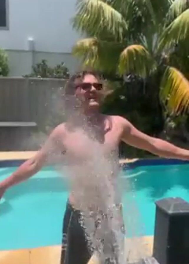 A shirtless man with sunglasses stands in front of a turquoise swimming pool with his arms outstretched, being sprayed by a shower of water. Palm trees and a white building are in the background. The man appears to be reacting to the water, possibly yelling, with his mouth open wide. He is wearing dark athletic shorts. The water seems to be coming from above him, creating a waterfall effect. A black fence post is visible on the lower right corner of the frame.