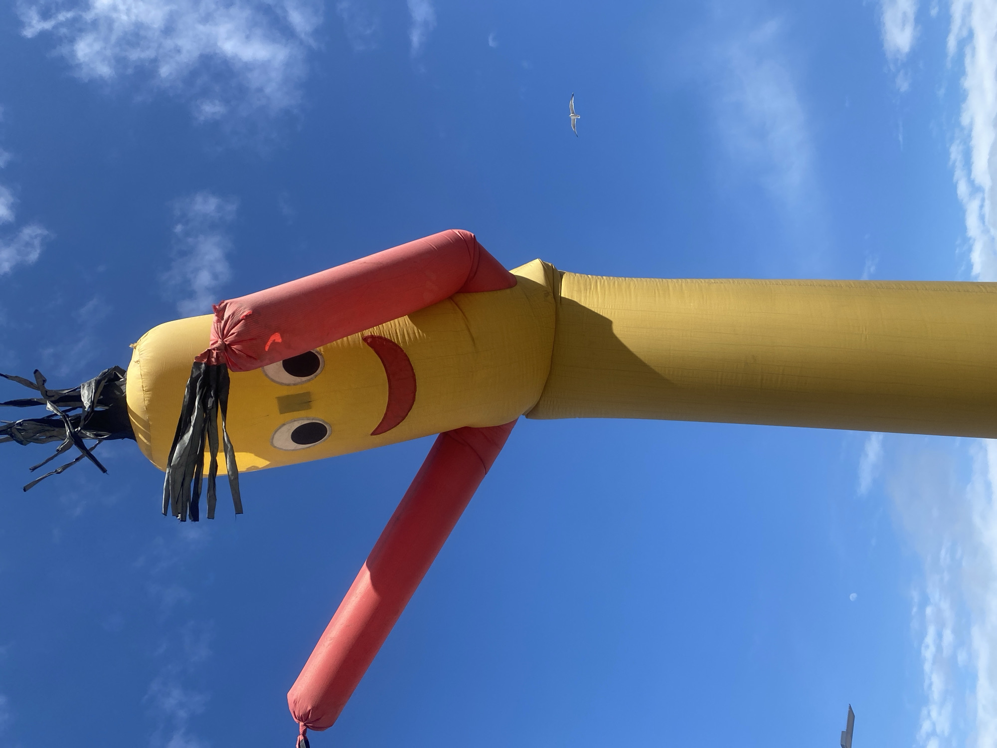 An inflated, yellow, anthropomorphic tube man stands prominently against a clear blue sky with scattered white clouds