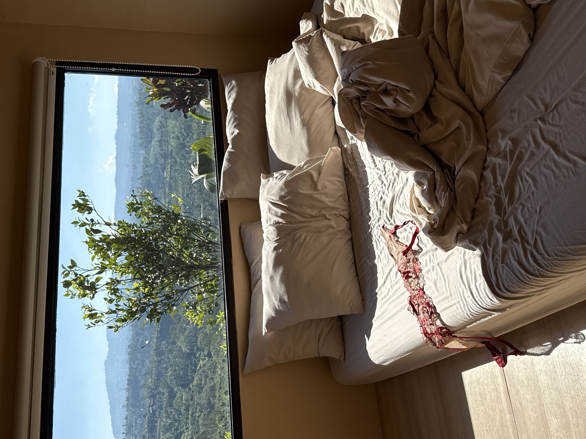 Here's a detailed description of the image: **Location:** Based on the image's scenic view through the window, this is likely a room in or near Petang, Indonesia. **Environment:** The image appears to be an interior shot, taken inside a bedroom. The room is sunlit, with strong light streaming in through a large window. Outside the window, there's a view of lush, green hills or mountains. **Objects:** The main object of focus is a large bed with white linens, multiple pillows, and a rumpled duvet. Lying on the bed, near the edge, is a delicate piece of lingerie. It is burgundy and appears to be made of lace or a similar fabric. The window has a dark frame, and a roller blind. **Composition:** The shot is taken from an elevated perspective, looking down onto the bed and the scene outside. The view outside the window provides context for the location. The disheveled bed linens suggest a state of repose or recent activity. The lingerie adds a more intimate element to the scene. **Overall Impression:** The photograph depicts a private, intimate space in a location with beautiful natural surroundings.