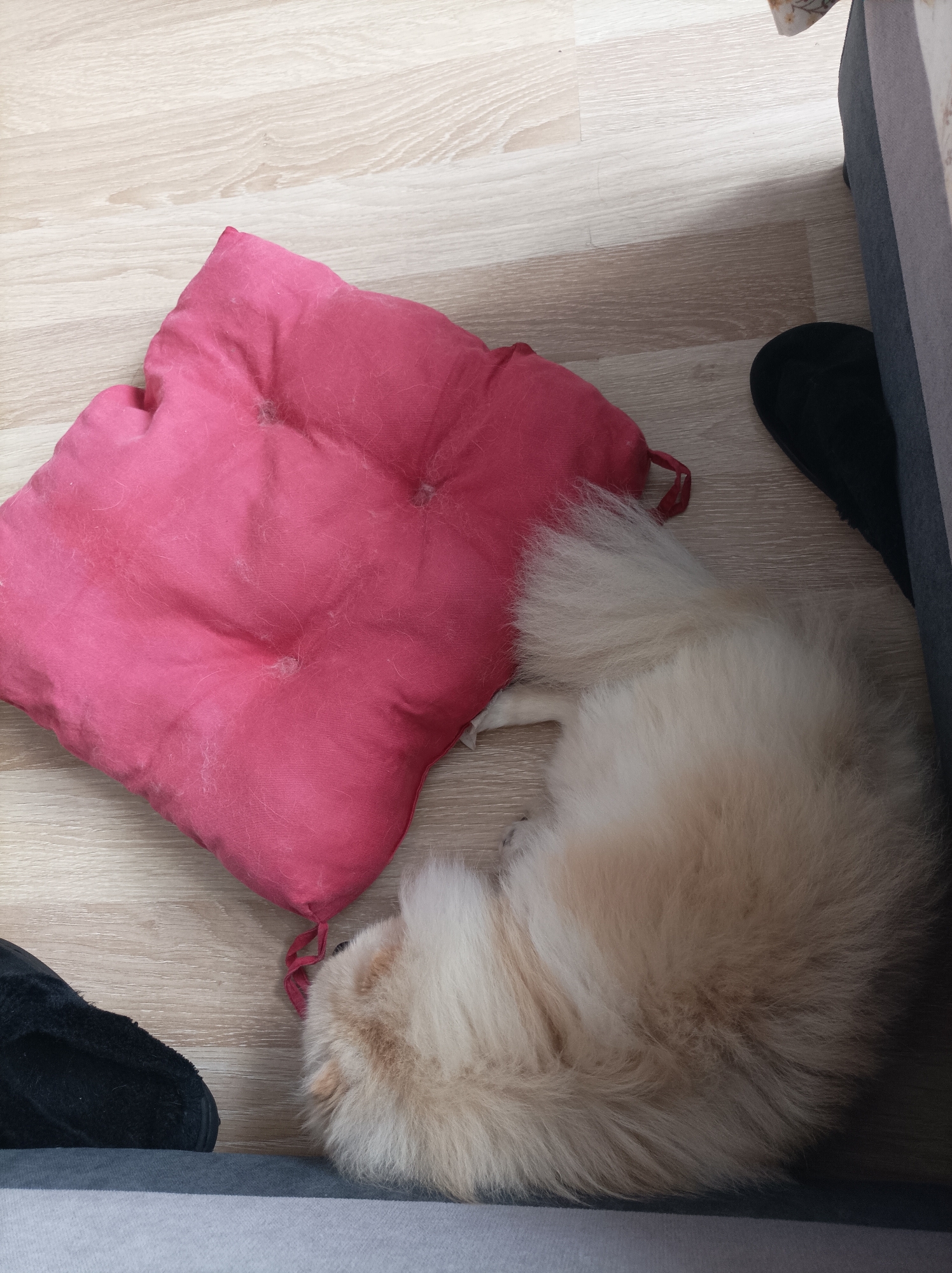 A high-angle shot shows a cream-colored dog curled up next to a pink cushion on a light-colored wooden floor. The dog's head is visible near the bottom left corner of the frame. The pink cushion is square-shaped and has tufted stitching at the center. Parts of a dark gray sofa are seen along the right and bottom edges of the frame, with a black slipper positioned adjacent to the sofa. The environment is indoors and the location is Cherven Bryag, Bulgaria.