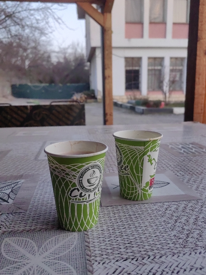 The scene is an outdoor setting in Gorna Beshovitsa, Bulgaria, viewed from under a wooden structure, with a prominent brown wooden beam visible on the right. In the immediate foreground, two disposable paper cups, predominantly green and white, are placed on a light-colored, textured table covering featuring interwoven geometric and leaf patterns. The left cup contains a reddish-brown liquid and has "Coffee Cappuccino Caffè Latte Chocolate" text and a coffee cup graphic. The right cup, appearing empty, also features a green and white pattern and sits on a square coaster with a leaf design. Beyond the table, a paved outdoor area extends. To the left, a dark, rectangular object with a patterned surface is visible, potentially a barbecue grill or a large planter. Further back, a low, dark green circular or semi-circular barrier or planter is present, behind which bare trees and shrubs with minimal foliage are observed. The background is dominated by a two-story building featuring a white facade with pink horizontal accent bands above and below its upper-story windows. Multiple dark-framed windows are visible across the building's front. The ground around the building is paved, with sections of small, light-colored curbing.