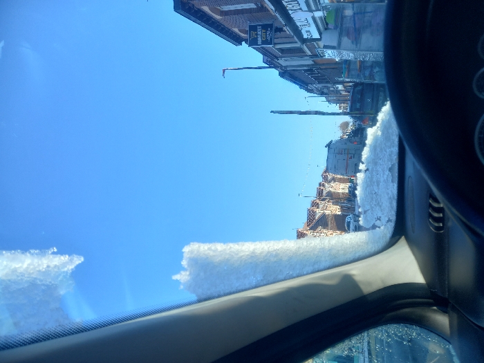 The image depicts a street scene in Noyelles-sous-Lens, France, viewed from inside a vehicle on a bright, clear day following snowfall