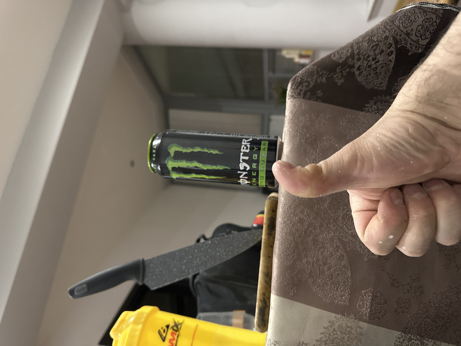 The scene depicts an indoor setting in Sofia, Bulgaria, likely a kitchen or dining area. In the immediate foreground, a male's right hand is visible, oriented with the palm facing away from the viewer, executing a 'thumbs up' gesture. Small white particulates are present on the surface of the hand. The hand rests above a table covered with a brown tablecloth featuring a repeating lighter brown pattern. On the table, from left to right: a partially visible yellow protein shaker bottle with a black lid; a large kitchen knife with a grey, speckled blade and a black handle, standing vertically; and a black Monster Energy Zero Sugar can, also standing upright. A light-colored, cylindrical object, possibly a rolling pin, lies horizontally on the tablecloth behind the knife. The background consists of light-colored walls and ceiling, with a large window or glass door featuring horizontal blinds visible in the distance. The lighting suggests an interior artificial light source. No other individuals or explicit actions beyond the 'thumbs up' gesture are observed.
