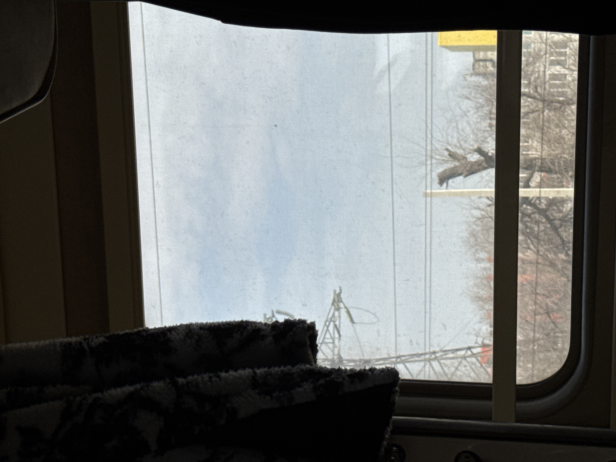 The image captures a view through a dirty or frosted window from inside a vehicle, likely a train or tram, in an urban or peri-urban area of Volgograd, Russia. **Scene Details:** * **Interior:** On the far left, a dark, patterned, fuzzy curtain or blanket hangs partially into view. The top portion of the image is obscured by dark, indistinct interior structures and panels. The window itself has a beige frame with a rounded lower edge and a horizontal divider running across the lower third. * **Exterior:** The sky is overcast with a light gray-blue hue. A large, metal lattice-style electrical transmission tower is prominent on the left side, extending upwards from outside the bottom-left window frame. Multiple thin, dark horizontal power lines are visible across the mid-ground. Below these lines, numerous bare deciduous trees, devoid of leaves, dominate the landscape, suggesting a late autumn or winter season. Through and beyond the skeletal branches of the trees, several multi-story buildings are partially visible, including one on the far right with a distinct bright yellow facade. No individuals are visible within the scene.