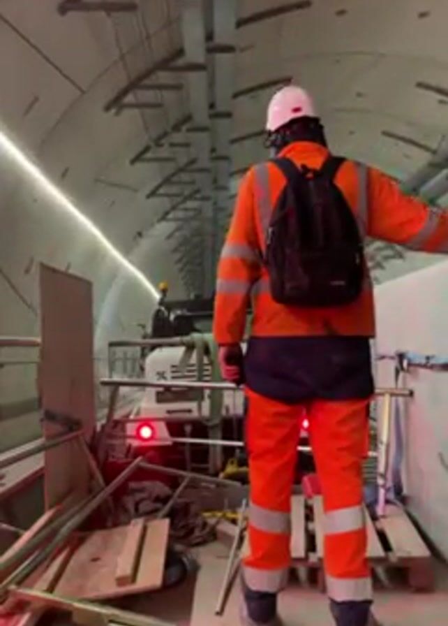 A man in a white hardhat, orange jumpsuit with reflective stripes, and a black backpack stands inside a long, curved tunnel under construction. He is facing away from the camera with his left arm outstretched. In front of him are various pieces of lumber and metal, and a small white vehicle with red tail lights. Another person wearing a hardhat can be seen operating the vehicle in the distance. Metal beams hang from the ceiling of the tunnel, which is illuminated by white lights.