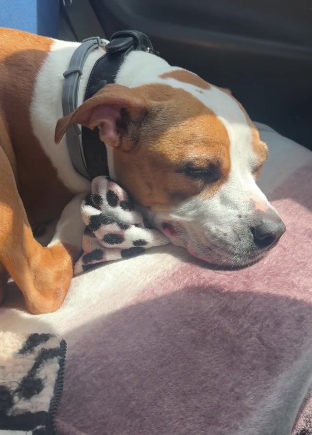 - "A medium shot captures a brown and white dog sleeping on a pink blanket in what appears to be the backseat of a car" by FM-HVLtJ2, licensed under CC BY 4.0