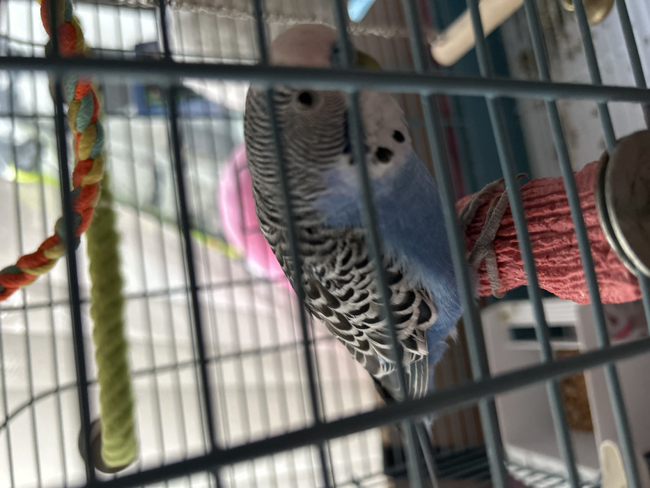 - "A budgerigar, exhibiting a light blue underside, white and black scalloped markings on its back and wings, and a light grey/white head with black stripes, stands on a textured red-orange perch within a wire cage" by FM-gaaxl2, licensed under CC BY 4.0