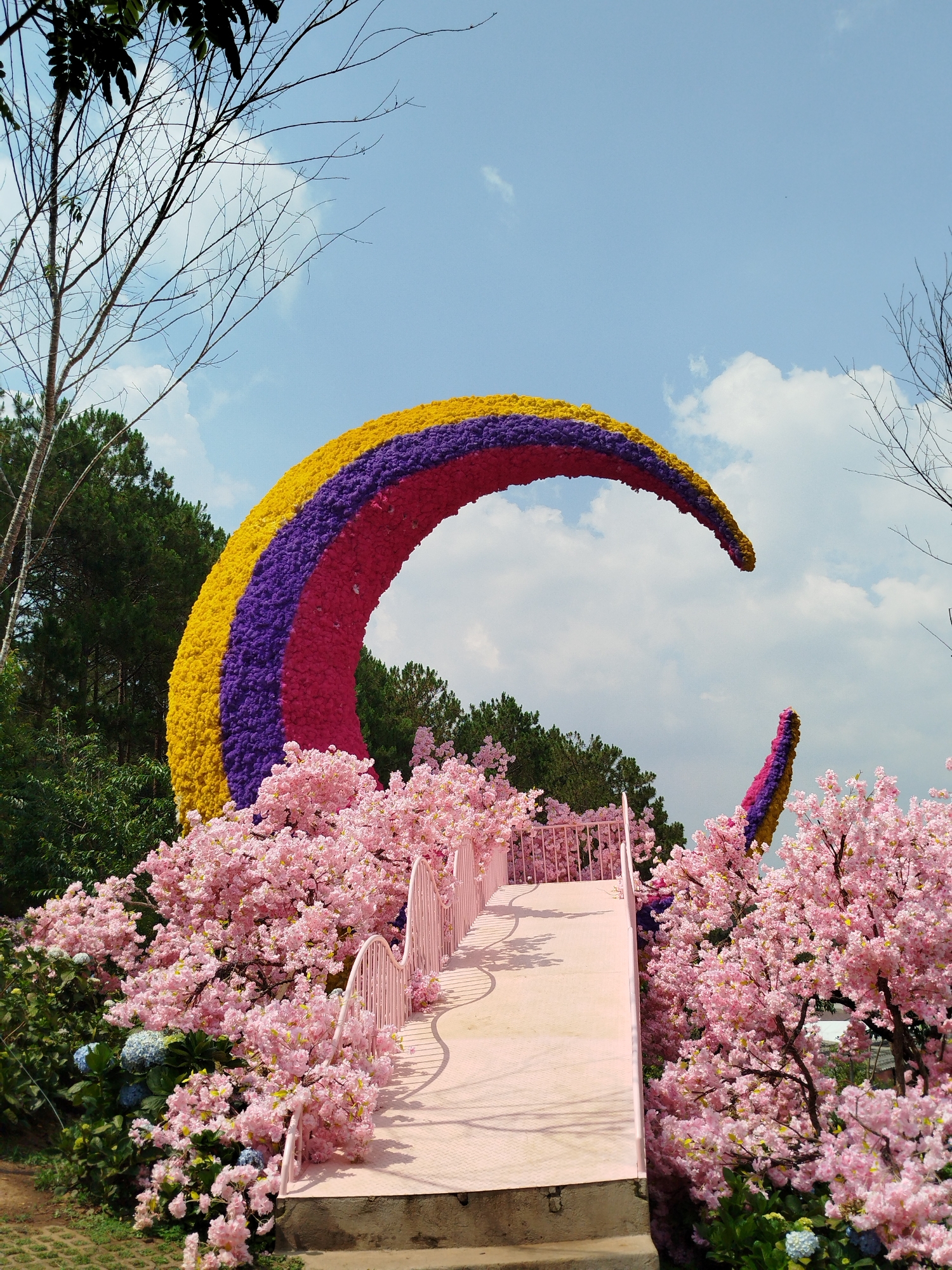 A wide, low-angle shot captures a fanciful scene in Lang Biang - Đà Lạt, Vietnam. A curved, color-blocked arch, reminiscent of a rainbow but arranged with yellow at the top, purple in the middle, and pink at the base, dominates the upper portion of the frame. This arch sits atop a pink bridge, which ascends from the lower portion of the image. The bridge has simple pink railings and a smooth, pink surface. Profuse pink blossoms, resembling cherry blossoms, surround the bridge, filling the middle ground of the shot. These blossoms are dense and almost completely obscure the bridge in some areas. Amidst the pink blossoms, there are also clusters of blue hydrangeas, adding a cool contrast to the scene. In the background, a line of evergreen trees provides a natural backdrop. Above the trees and the arch, the sky is visible, displaying a mix of blue and white clouds. Bare tree branches are visible on the sides of the image, framing the scene. The ground in the foreground is a mix of dirt and small plants.