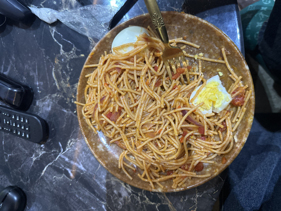 This image captures an overhead view of a meal on a dark, veined marble-patterned table in Orie Uratta, Nigeria. The primary subject is a round, speckled brown ceramic plate containing spaghetti mixed with a reddish sauce, red onion slices, diced tomatoes or peppers, and visible red chili flakes. Two halves of a hard-boiled egg are positioned on the plate; one is largely intact, while the other shows signs of partial consumption. A golden-colored metal fork, featuring an ornate handle design, is present within the spaghetti, suggesting an ongoing meal. In the upper background, a black computer mouse, a black remote control, and another black electronic device are arranged on the table surface. To the right of the plate, a crumpled translucent plastic bag is visible. The lower portion of the image reveals a person's lap, with dark blue denim jeans on the left and a green-and-white patterned fabric on the right, indicating a seated individual consuming the meal.