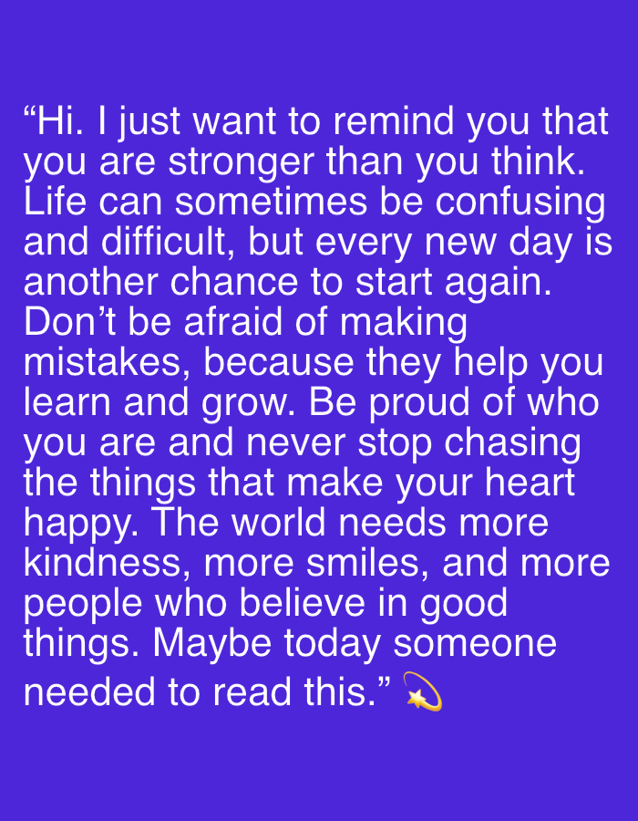 The image is a digital graphic, located in the city of Ivailo, Bulgaria. It features a solid, deep purple background with white sans-serif text centrally positioned. The text presents a motivational message enclosed in quotation marks: "Hi. I just want to remind you that you are stronger than you think. Life can sometimes be confusing and difficult, but every new day is another chance to start again. Don't be afraid of making mistakes, because they help you learn and grow. Be proud of who you are and never stop chasing the things that make your heart happy. The world needs more kindness, more smiles, and more people who believe in good things. Maybe today someone needed to read this." A yellow star emoji with a white orbital ring is situated immediately to the right of the closing quotation mark. No people, discernible subjects beyond the text and emoji, actions, or physical interactions are depicted. The environment is a digital display of text on a colored background.