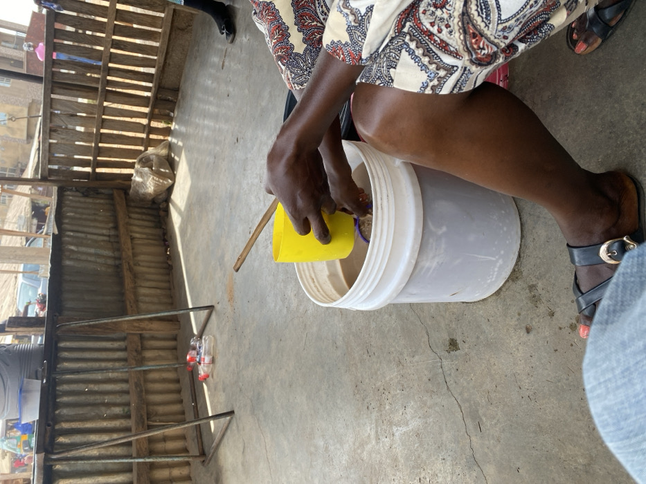 An outdoor scene in Vom, Nigeria, depicts a person in the mid-ground actively preparing a substance. The individual, exhibiting dark skin and wearing a patterned white dress with black sandals, is observed scooping a light brown, turbid liquid from a large white and grey plastic bucket. A yellow plastic cup and a small purple sieve are utilized in this action, with a wooden stick resting on the cup's rim. In the foreground, the knee and lower thigh of another person wearing blue denim are partially visible. The background consists of a corrugated metal sheet wall on the left and a wooden slatted fence on the right, enclosing a concrete ground where several discarded plastic bottles and reddish-brown debris are present near a metal frame. A light-colored sack rests against the wooden fence. Distant buildings and a vehicle are visible under bright daylight.