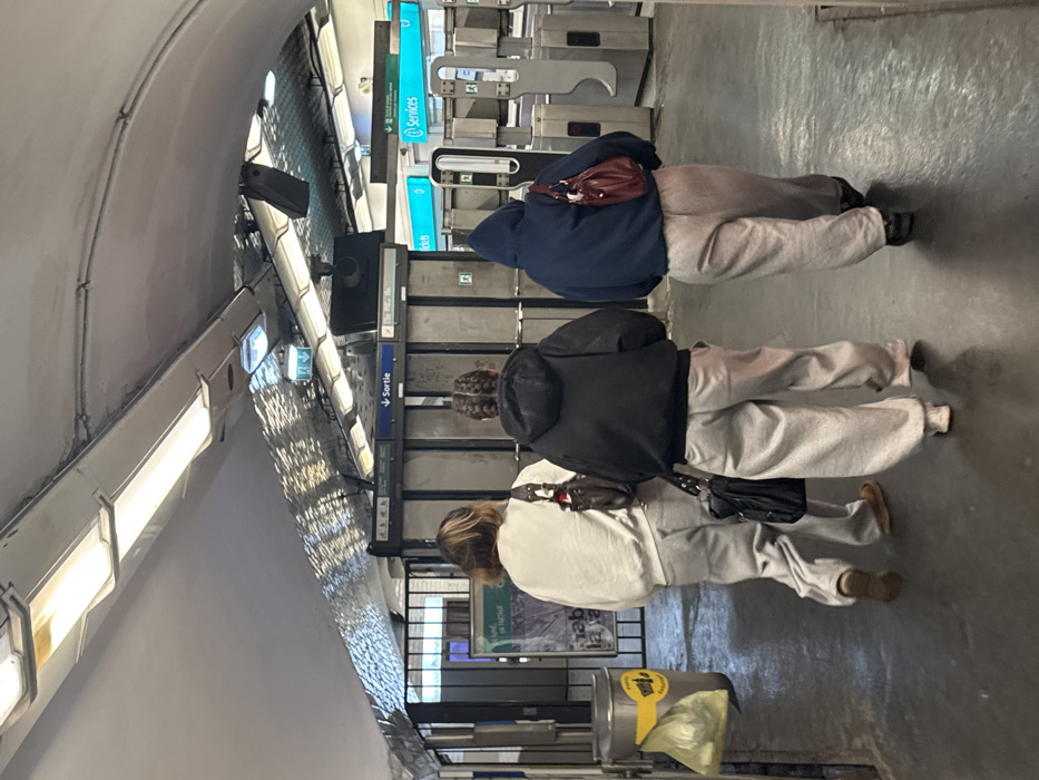 - "The image displays three individuals walking away from the camera through an indoor public transit concourse, identified as a metro station in Vincennes, France, by visible "Sortie" and "Tickets" signage" by FM-kZ4ZN2, licensed under CC BY 4.0