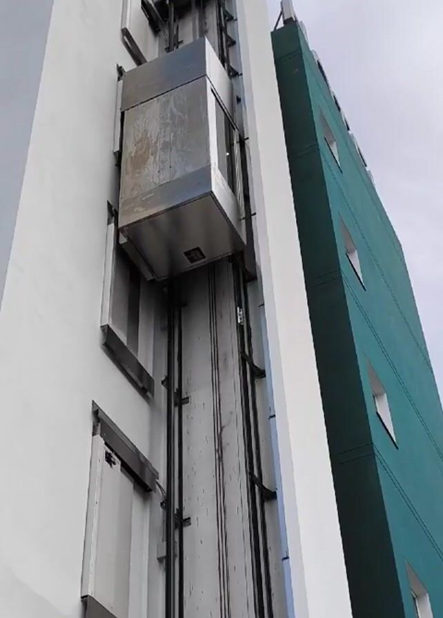 metal elevator ascending the outside of a tall building. The building has white, gray, and teal sections, with windows visible on the teal section. The elevator is in a shaft with visible supporting beams and wires. The sky is overcast.