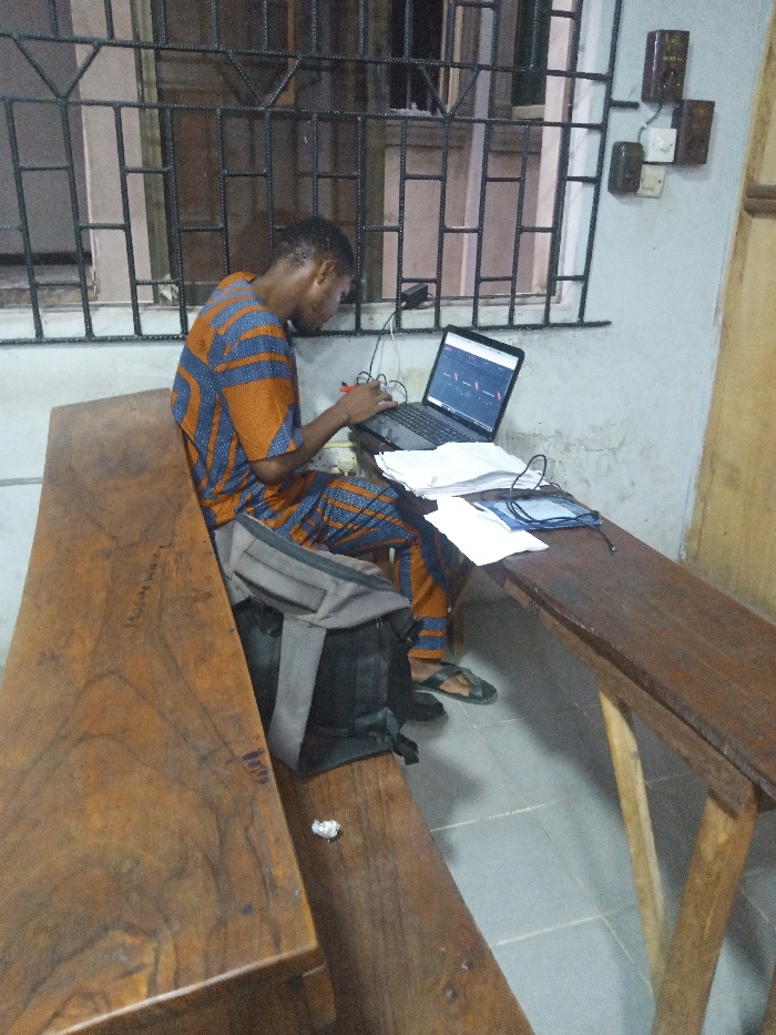 A man sits at a long wooden desk, working on a laptop. He's dressed in a patterned orange and blue outfit, with a grey and black backpack beside him. Papers and a tablet are also on the desk. The setting is a simple room with a barred window behind him and light-colored walls with old electrical boxes. The floor is tiled. He wears brown slippers.