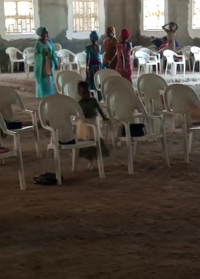 The scene depicts the interior of a large, unfinished building, likely a church or gathering space. The dirt floor is the only visible flooring. Several people are present, mostly women, dressed in colorful traditional African clothing. They are standing in a group towards the back of the room, seemingly chatting. A young girl in a white dress and sneakers is walking in the foreground, between rows of white plastic chairs. The chairs are arranged in a way that suggests a planned seating arrangement. The building has large windows which bring in daylight, yet the overall lighting is dim and muted. The walls appear to be unfinished, revealing raw concrete.