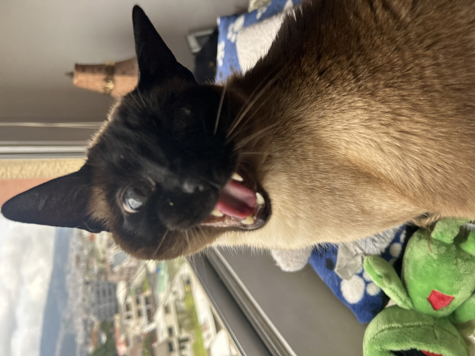 A Siamese cat with piercing blue eyes is captured in a close-up shot, its mouth wide open, revealing its teeth and pink tongue. The cat's fur is a mix of dark brown on its face and ears, transitioning to a light tan color. A city skyline is visible in the background through a window. A blue patterned pillow and a green stuffed frog toy are visible next to the cat.