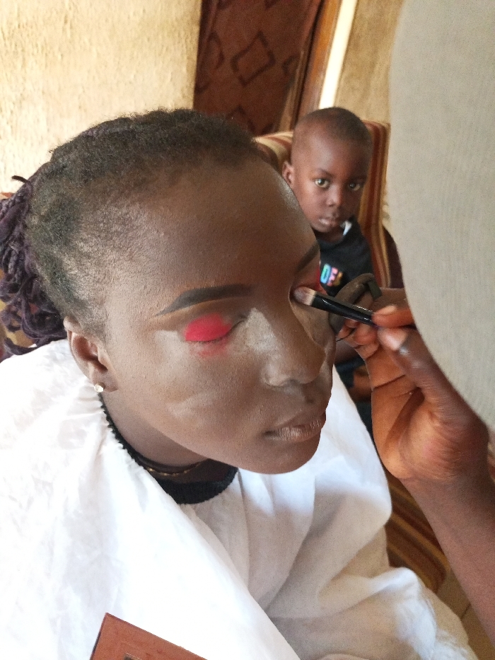 An indoor scene in Unknown, Unknown, shows a dark-skinned adult female receiving makeup application