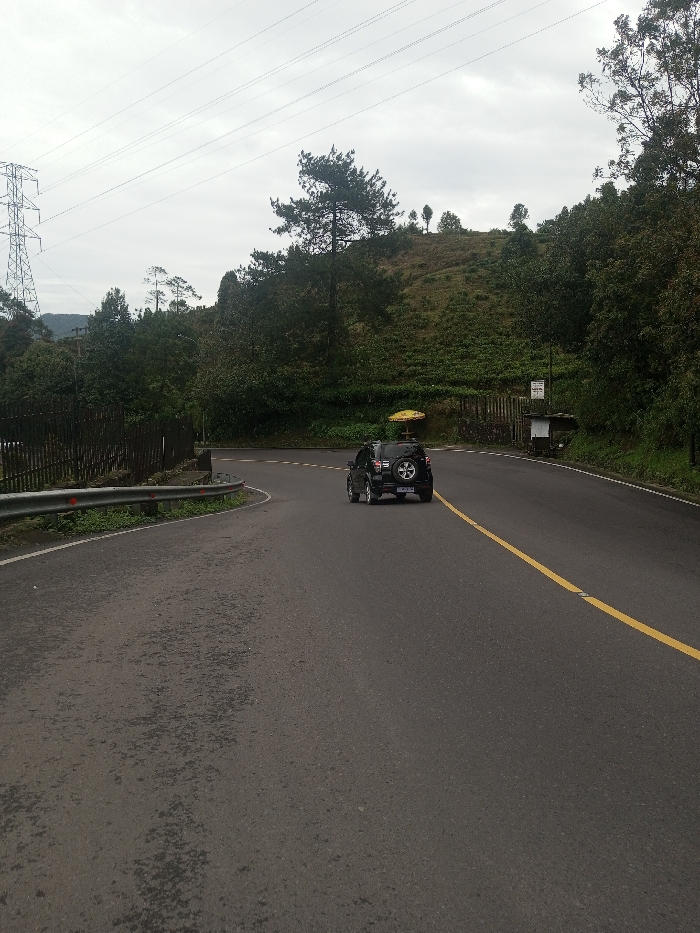 The image displays an asphalt road curving through a hilly, vegetated landscape in Ariyalai, Sri Lanka, under an overcast sky. A dark-colored SUV, viewed from the rear and featuring an externally mounted spare tire, is driving away from the viewer, navigating a gentle rightward bend in the road. A continuous yellow line marks the road's center or edge on the right. To the immediate left, a metal guardrail with red circular reflectors follows the curve of the road. Further left, a dark wooden fence runs parallel to the road, and a tall metal lattice power transmission tower with overhead lines is visible in the distance. The hillsides are covered with dense green foliage, including tall trees and what appears to be cultivated ground cover. On the right side of the road, at the curve, a wooden gate marks an entrance. Adjacent to this entrance are a small yellow umbrella-like structure, a rectangular sign affixed to a post, and a compact box-like structure. No people are visible.