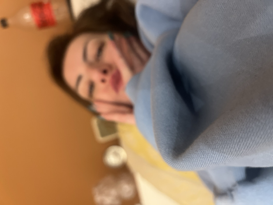 A blurry image shows a person with brown hair, fair skin, and red lips, wearing a light blue hooded sweatshirt