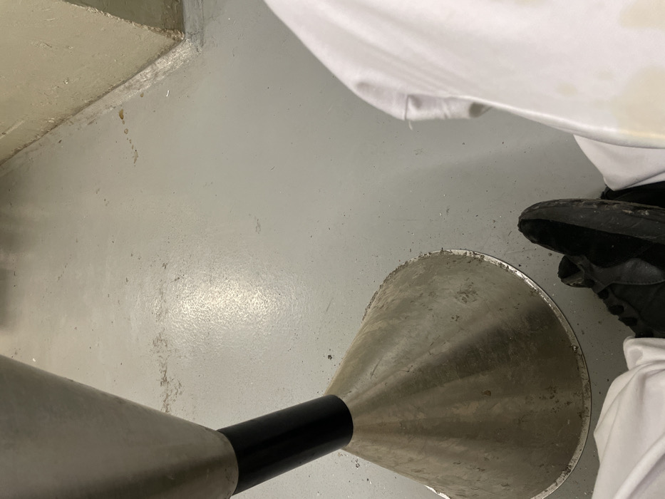 The image presents a downward-angled view of an indoor setting, purportedly located in Bochum, Germany, though no specific geographical identifiers are discernible within the frame. The scene features a light gray, textured floor displaying numerous small dark specks and minor discoloration. In the foreground, the lower portion of a person's body is visible. White trousers, exhibiting several light brown stains on the right leg, are worn by the individual. A black shoe or boot is partially visible on the floor beneath the trousers, appearing scuffed. To the left, a prominent metallic object, possibly the base of a stand or piece of equipment, rests on the floor. It features a broad, conical, and flared base made of dull, brushed, or worn metal, showing accumulated dirt and grime. A black cylindrical column extends vertically from the center of this base, disappearing out of the upper left frame. In the background, a light brown or tan wall forms a corner with the floor on the right side of the image. The base of the wall near the floor shows some yellowish-brown stains or marks. The overall environment suggests a utilitarian or industrial interior, characterized by practical construction materials and signs of use.