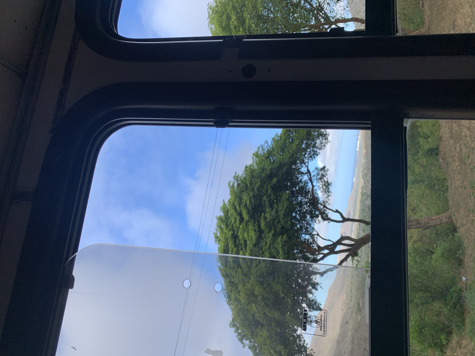 A view from inside a vehicle, likely a bus or van, showing the exterior through two windows