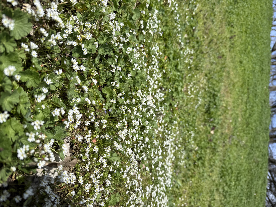 The image depicts an outdoor natural scene in the city of Senokos, Bulgaria. The foreground is filled with a dense carpet of small white wildflowers and green foliage, covering the ground. Each flower is composed of multiple small white petals. This floral growth extends upwards onto a gently sloping grassy hill that occupies the midground and background, becoming less concentrated with distance. At the very top of the incline, a blurred line of dark green trees or shrubs is visible against a strip of clear blue sky. The scene is illuminated by natural daylight. No individuals, animals, man-made objects, or discernible actions or interactions are present within the frame. The perspective is low-angle, focusing on the flora closest to the viewer.