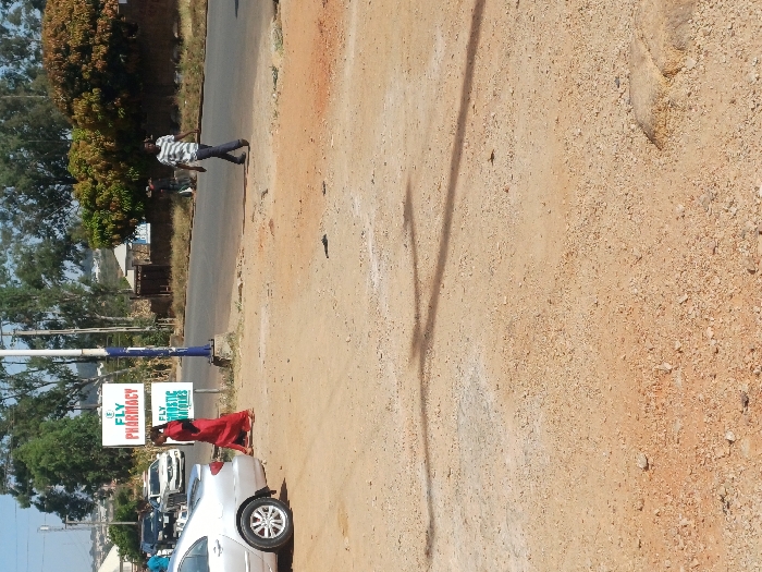This image depicts a daytime scene on a dirt and asphalt roadside, identified as being in the city of Jos, Nigeria