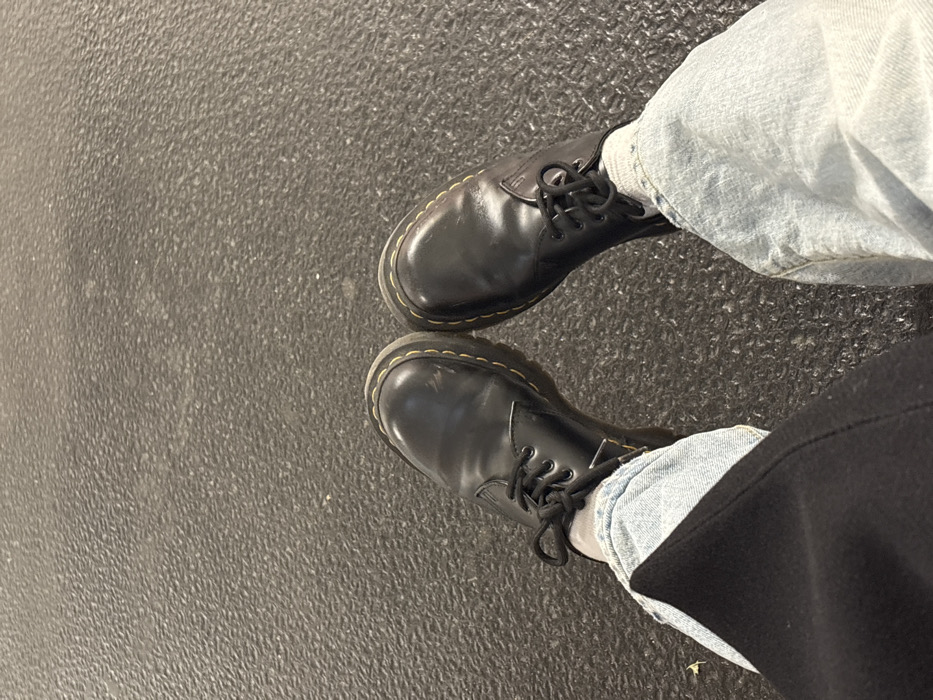 The image displays a downward-facing, first-person perspective of a person's feet and lower legs. The individual wears black, low-cut, lace-up shoes featuring distinctive yellow stitching around the sole, consistent with Dr. Martens footwear. The shoes show minor scuffing and creasing, indicative of use. Light-colored socks are visible between the shoes and light blue denim jeans, which are slightly cuffed or hemmed. A segment of a black garment, possibly a coat or broader trouser leg, is partially visible on the left side. The feet rest on a dark, likely black or very dark grey, textured floor surface, characterized by a uniform, raised granular or pebble-like pattern, suggesting a durable, anti-slip material often found in public or commercial spaces. The background is entirely composed of this floor texture. The specific location within Asnières-sur-Seine, France, is not discernible from the visual information provided in the image.