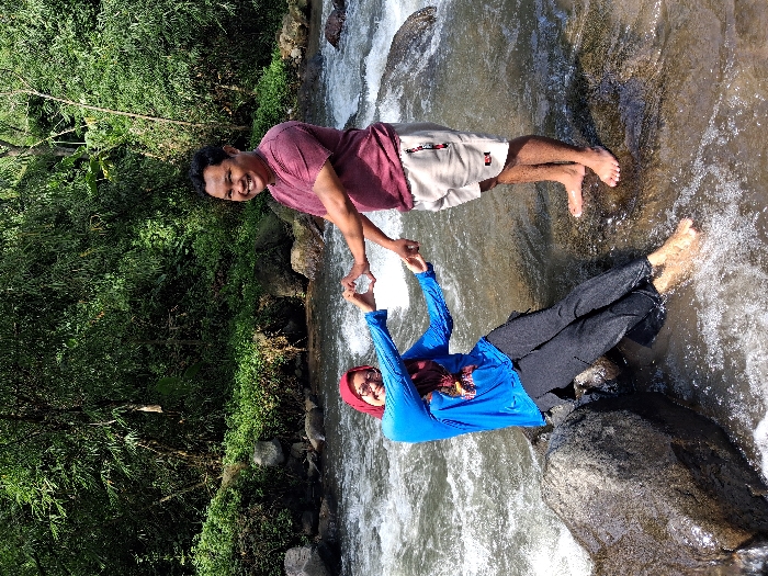 A man and a woman are standing in a shallow river, holding hands to form a heart shape. The man is wearing a maroon shirt and khaki shorts, while the woman wears a blue long-sleeved shirt, a red hijab, and dark pants. They both have bare feet. The river flows around rocks, and the river bank is lined with lush green vegetation. They are both smiling.