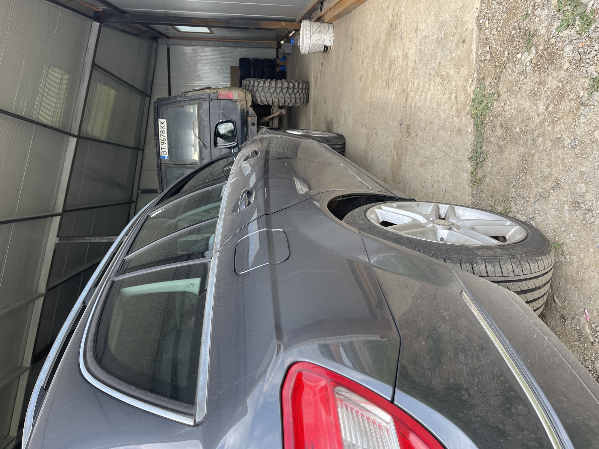 In Dragijevo, Bulgaria, a gray Mercedes-Benz wagon is parked in a garage alongside an older, dark-colored truck with the license plate "BT 9678 KK." The garage is simple and appears to be constructed of corrugated metal. A stack of large off-road tires is visible in the background, along with a white bucket hanging overhead. The exterior of the Mercedes is dusty, and a spare tire is resting on the ground near the car. The ground outside the garage is concrete, transitioning to a dirt and gravel surface.