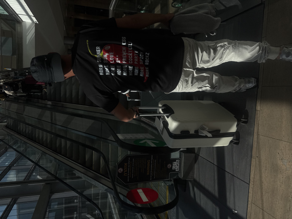 An indoor scene within a modern building, likely a transportation terminal, in Unknown, Israel. The primary subject is a male figure, viewed from behind, standing at the base of two escalators. He wears a black bucket hat, a black t-shirt with a red chili pepper graphic on the back and white text listing phrases like "MORE SUMMER," "MORE SUN," "MORE LOVE," "MORE S**," "MORE FRENCH KISS," "MORE COCKTAILS," "MORE PARTY," "MORE SPICY," and "MORE ROCKZ." He is dressed in light grey cargo pants and athletic shoes. In his right hand, he holds the extended handle of an off-white, hard-shell rolling suitcase with luggage tags. A grey piece of fabric is held in his left hand. To his left, a black rectangular sign with a red "do not" symbol (circle with a horizontal bar) displays Hebrew text, "אזהרה" (Warning), followed by English text: "WARNING Do not use the escalator with luggage." Below this, icons for a wheelchair and a stroller with a diagonal line indicate restrictions. A green arrow points upwards next to the sign. Two parallel escalators with dark steps, black handrails, and clear glass side panels ascend into the background. Several indistinct figures are visible further up the ascending escalator. The environment features large glass window panels, reflecting interior structures and allowing natural light, which creates areas of strong light and shadow on the tiled and metal grate flooring.