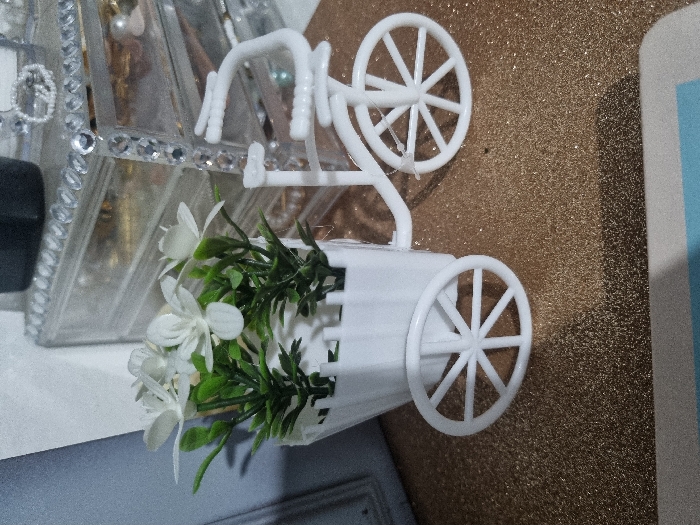 The scene depicts an indoor arrangement, specifically located in the city of Moguer, Spain. In the foreground, a miniature white decorative tricycle-style planter is centered on a golden, glitter-covered surface. The planter features a bicycle-like front frame with two spoked wheels and handlebars, attached to a rectangular basket-style pot that has a fence-like upper edge and is supported by a single spoked wheel at the rear. Within this white pot are several artificial green plant stalks bearing multiple white five-petaled flowers. In the background, to the right of the planter, a clear acrylic multi-drawer storage box is visible. Its edges are adorned with rows of small, reflective silver-colored rhinestones. Partially visible contents within the box include a white ring-like object and a pearl-like bead. A plain, light blue-grey vertical surface is present in the upper left background. No individuals are depicted in the image.