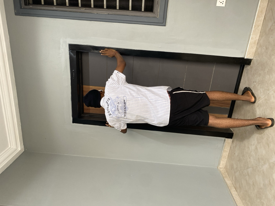 A person wearing a turban, short-sleeved shirt, and black shorts stands in front of an elevator. Their hands rest on the elevator doors. The room features gray walls and tile flooring. There is a window above the elevator and an electrical outlet near the ceiling. The person is wearing black flip-flops.