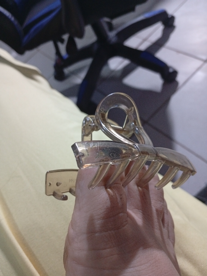 - "An adult human hand holds a transparent, amber-tinted plastic hair claw clip in an indoor setting within an unspecified city and country" by FM-TSYyh2, licensed under CC BY 4.0