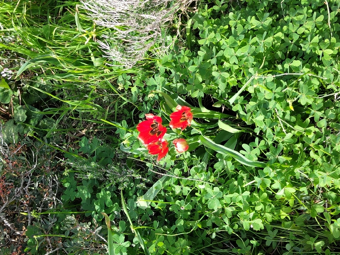 A natural outdoor scene in the Hof HaCarmel Regional Council, Israel, is depicted under bright daylight conditions. The primary subjects are five tulip-like plants clustered centrally within a dense field of green foliage. Three of these plants display fully opened, vivid red flowers with dark internal structures, while two smaller, partially opened or budding flowers show a reddish-orange coloration. The ground cover consists predominantly of vibrant green, three-lobed, clover-like leaves. Ancillary vegetation includes taller, lighter green grasses to the right and a silvery-green, slender-leafed shrub in the upper right. Further dense green growth, including small-leafed bushes and intertwined stems, fills the background and left side of the frame, indicating an uncultivated or wild natural setting.