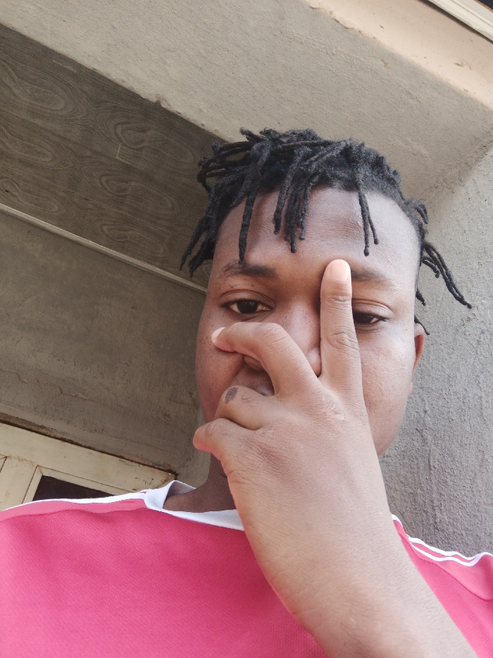 A young individual with dark skin and dreadlocks, wearing a red shirt with a white collar and shoulder stripe, is depicted in a selfie-style portrait taken in Keffi, Nigeria
