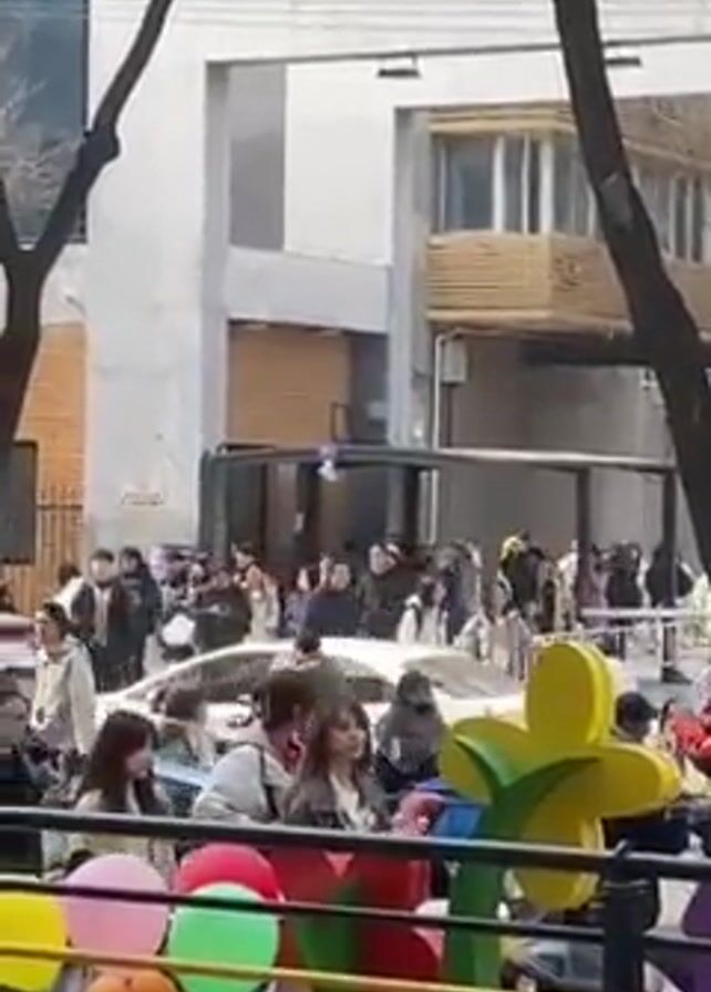 busy city street with a large group of people gathered near a building. Many of the people are wearing masks. There are several parked cars and motorbikes visible. In the foreground, there's a decorative structure resembling flowers and balloons. The trees are bare, suggesting it might be late fall or winter. The overall impression is of a crowded urban setting, possibly a gathering or event is occurring by the building.