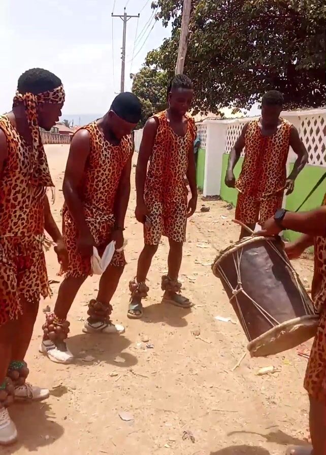 In an eye-level shot, four African men wearing matching leopard-print outfits and ankle rattles are dancing. The dancers bend forward, mimicking a prowling cat. A fifth man stands apart from the others, facing them and playing a drum. The scene takes place on a dirt road in front of houses. Trees and a telephone pole are also visible. The lighting is bright, indicating a sunny day.