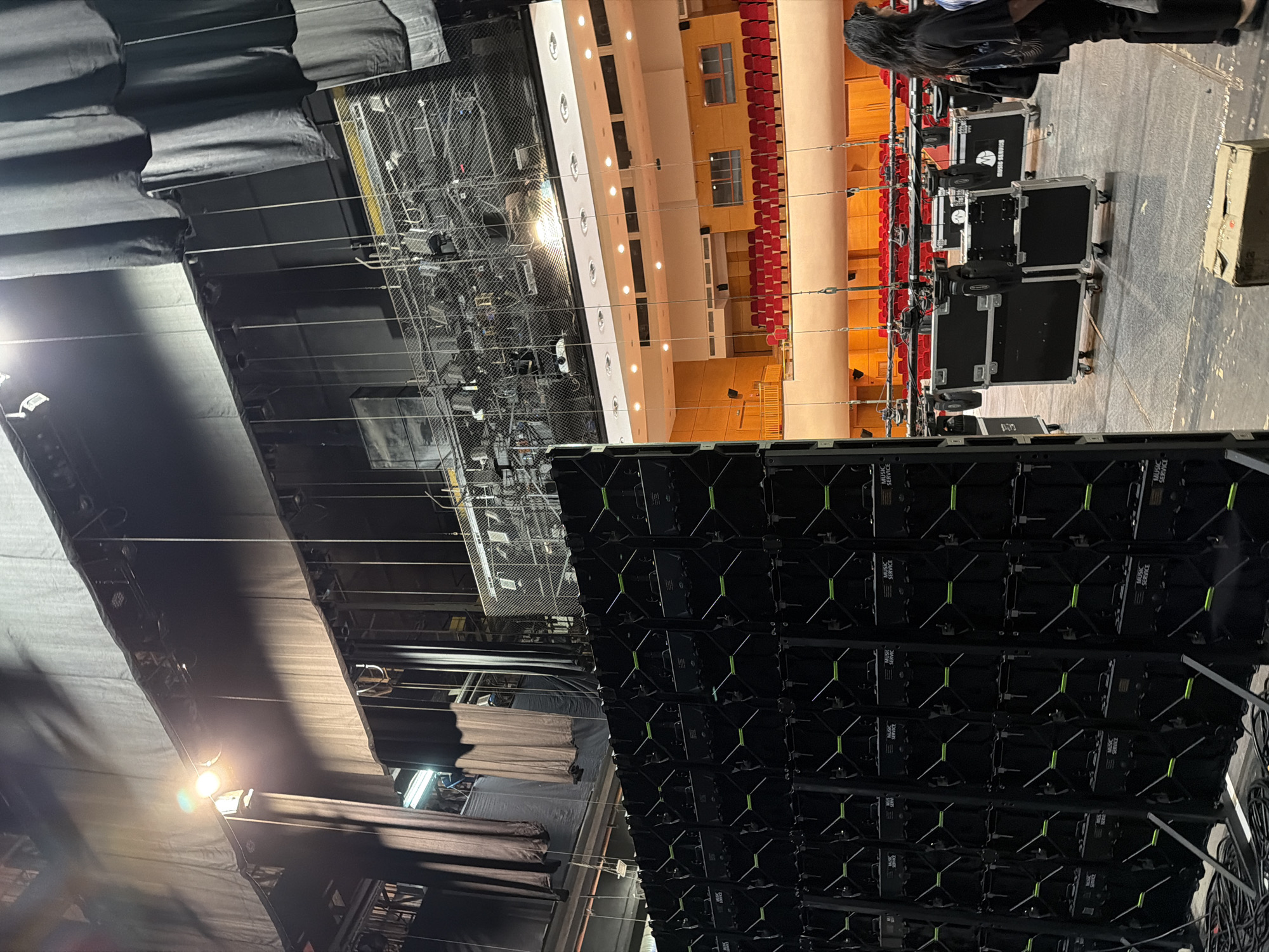 The image depicts the interior of a theater or concert hall in Plovdiv, Bulgaria. The stage is in the foreground with black stage curtains and a large LED screen structure. Behind the screen, there is a metal scaffolding structure with lighting equipment. The hall has rows of red seating, and a light-colored wall with evenly spaced lighting fixtures above the seating area. There are several black cases with the label "Music Service" on the right side of the image, indicating that the equipment relates to music production. One person is partially visible standing in the center of the image and the area seems to be prepared for an event or performance.