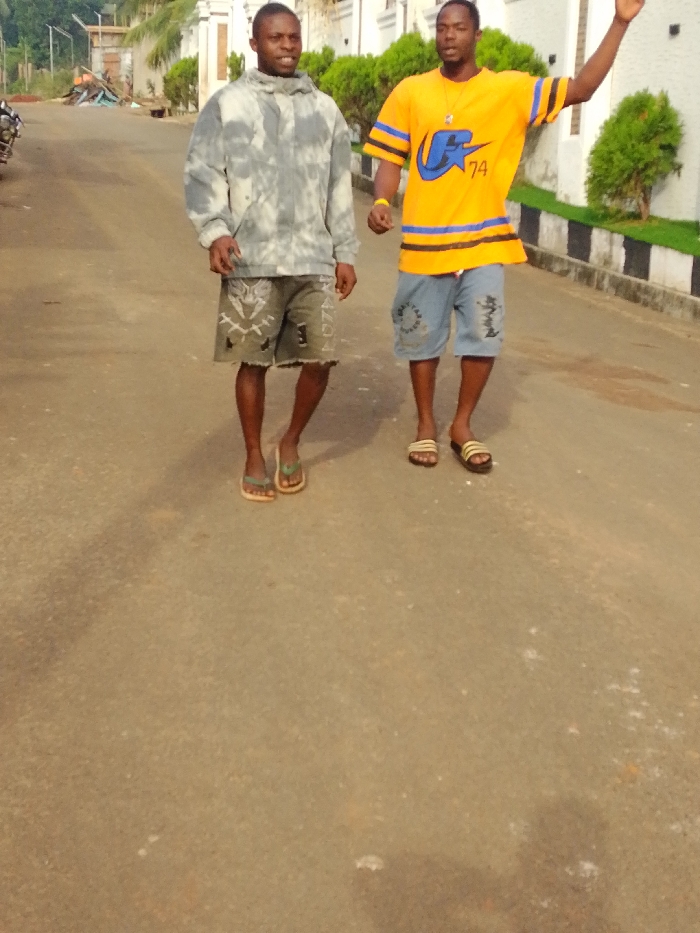 Two men stand on a paved street. One wears a grey and white hooded sweatshirt and patterned shorts. The other wears a yellow and blue t-shirt with jean shorts. Both have on sandals. The man in yellow raises his arm. A building sits behind them on the right, and a street with buildings is behind them on the left. Green bushes are to the right of the men.