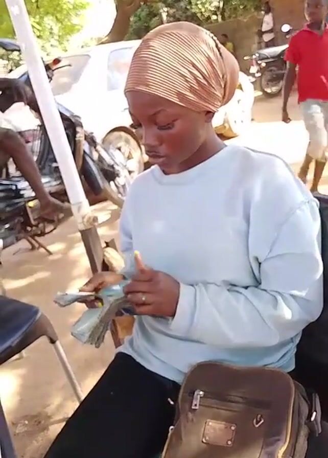 A young woman with a brown headscarf is sitting on a chair in an outdoor setting. She is wearing a light blue long-sleeved shirt and black pants. In her hands, she holds a stack of banknotes, which she appears to be counting. A brown satchel bag sits beside her on the chair. A table with a calculator on it is visible to her left. In the background, there are people walking around, parked motorcycles, and a white car. There are also trees, suggesting a public area like a market or a street. The camera is stable, focused on the woman counting money.