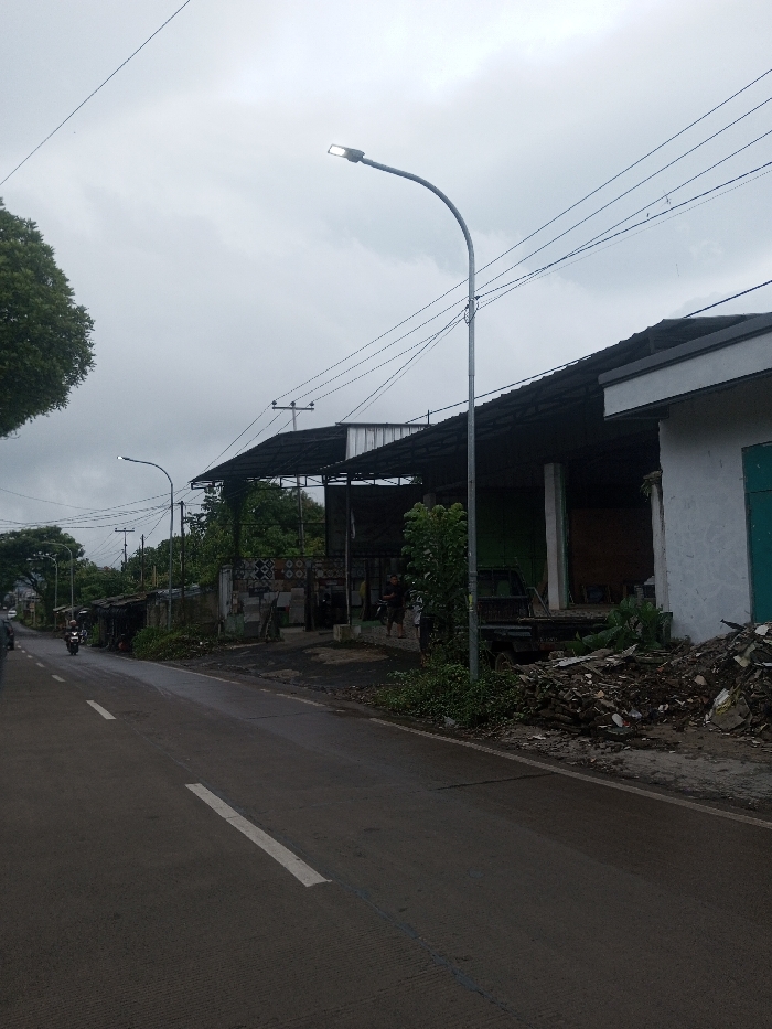 A street scene showcases a wet, dark asphalt road with a white lane marker. Buildings with dark roofs line the right side of the road, accompanied by a streetlight. A motorcycle drives on the left side. Debris and vegetation clutter the roadside. Overhanging electrical lines stretch across an overcast sky. People stand near the buildings.