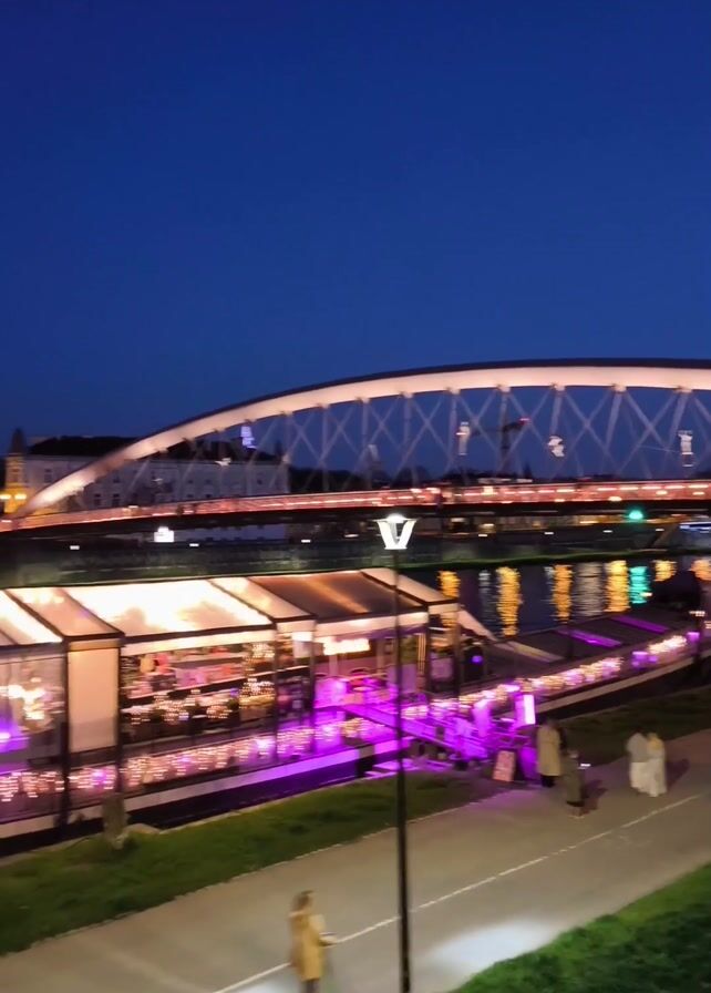 The video depicts a nighttime urban scene. A river flows in the foreground, reflecting the lights of a bridge that spans its width. The bridge is white and arched. Moored to the riverbank is a boat-like structure with a transparent roof, brightly illuminated in shades of white and purple. People are visible inside. On a paved path alongside the river, pedestrians stroll and individuals ride electric scooters. The sky above is a deep, clear blue. In the distance, buildings with illuminated windows are discernible against the night sky.