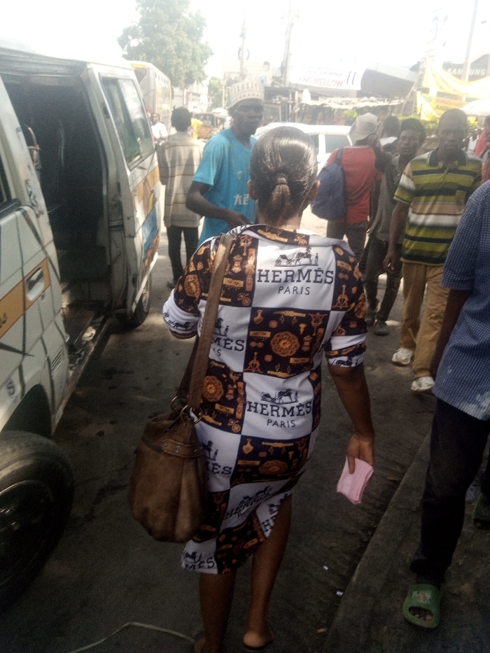 A woman wearing a dress patterned with "Hermes Paris" logo stands in a busy street scene